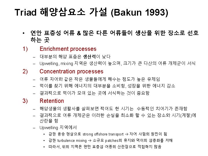 Synthetic theories (continued) 2) Triad hypothesis (Bakun, 1993) - Enrichment of food (upwelling, mixing, etc) - Retention of the eggs and larvae within suitable nursery areas (offshore transport, advection of other water masses) - Concentration of food particles for the first-feeding larvae and subsequent development stages (convergence, frontal formation, water column stability)
