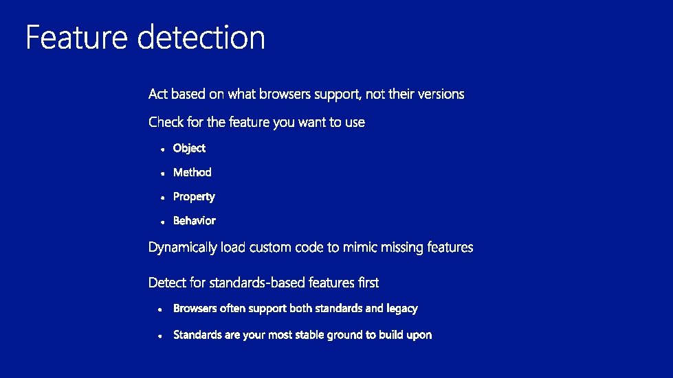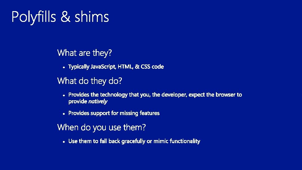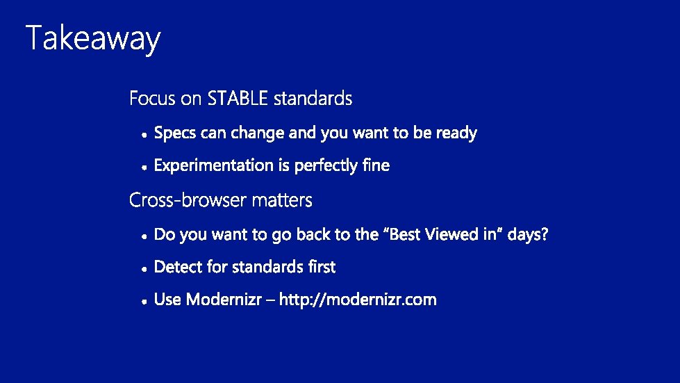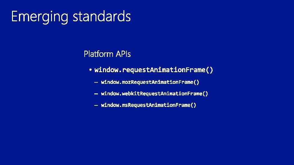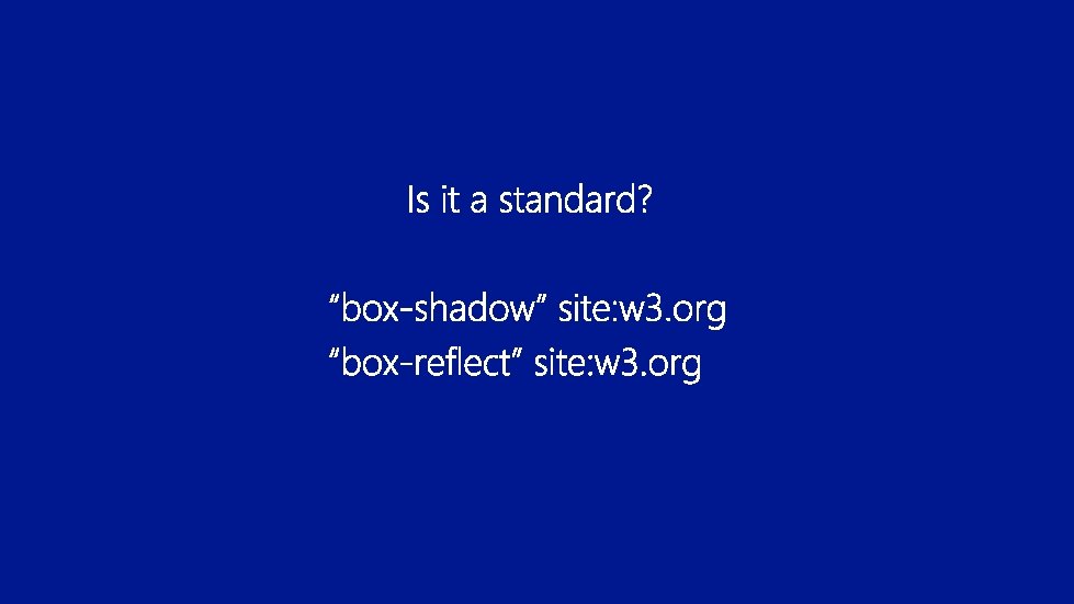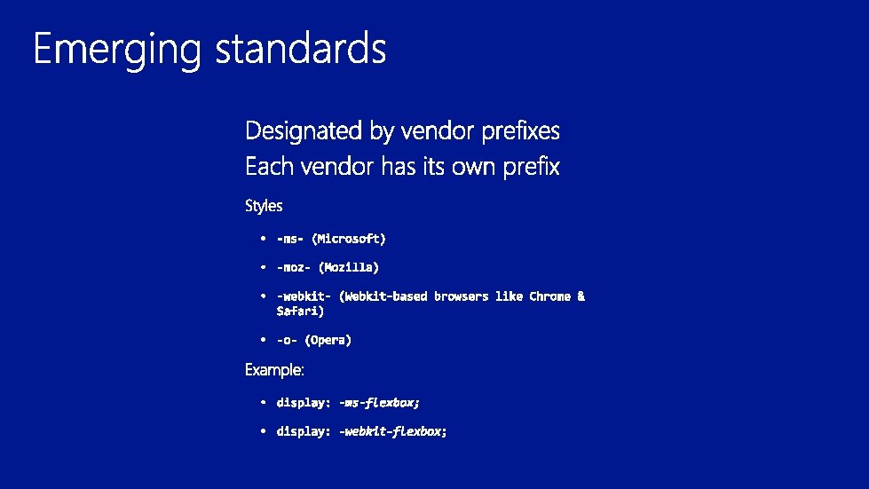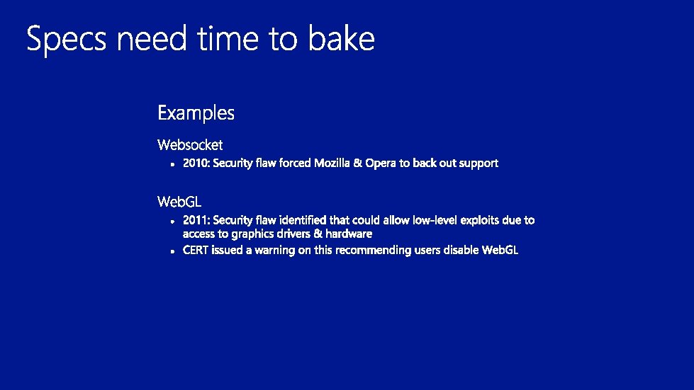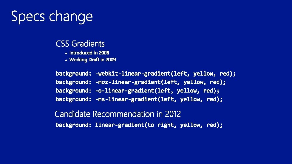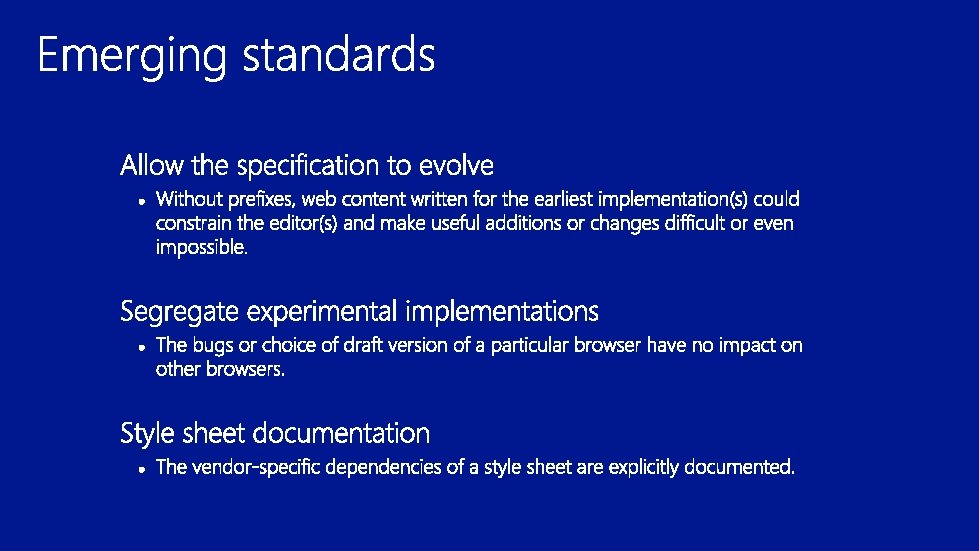 • There were no recent additions or changes and no renaming or major changes are expected • Supported by at least two browsers other than Internet Explorer 10 • Interoperable across all these browsers for the features’ core use cases • Already used on the Web, including in their unprefixed form • Reached Candidate Recommendation or are likely to become Candidate Recommendations