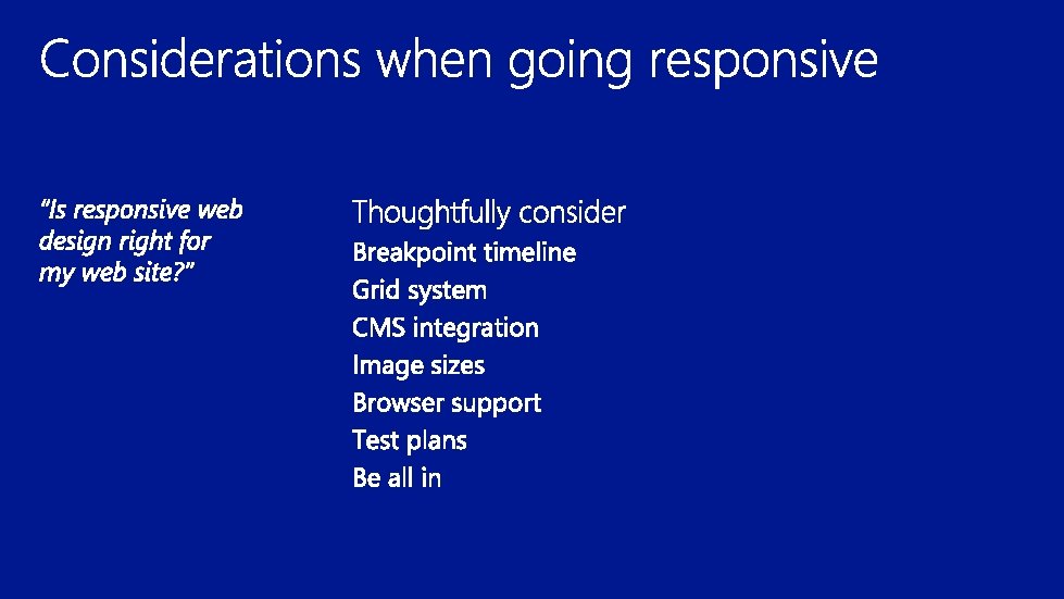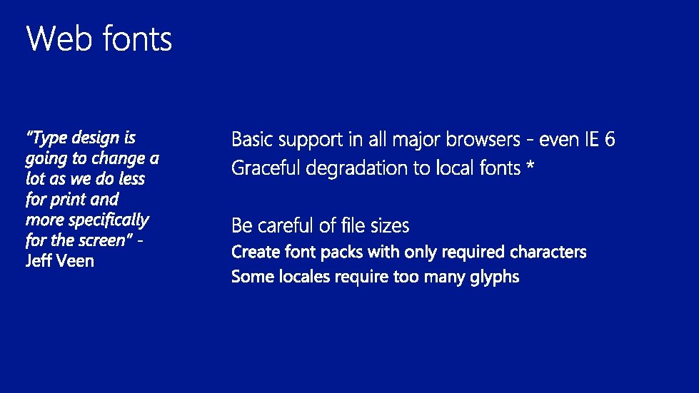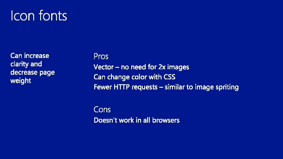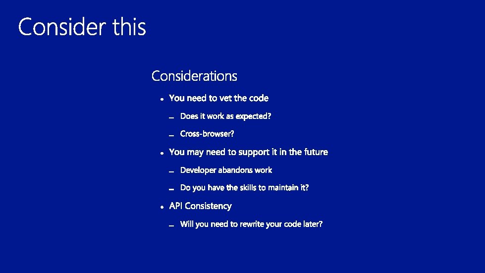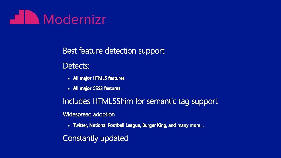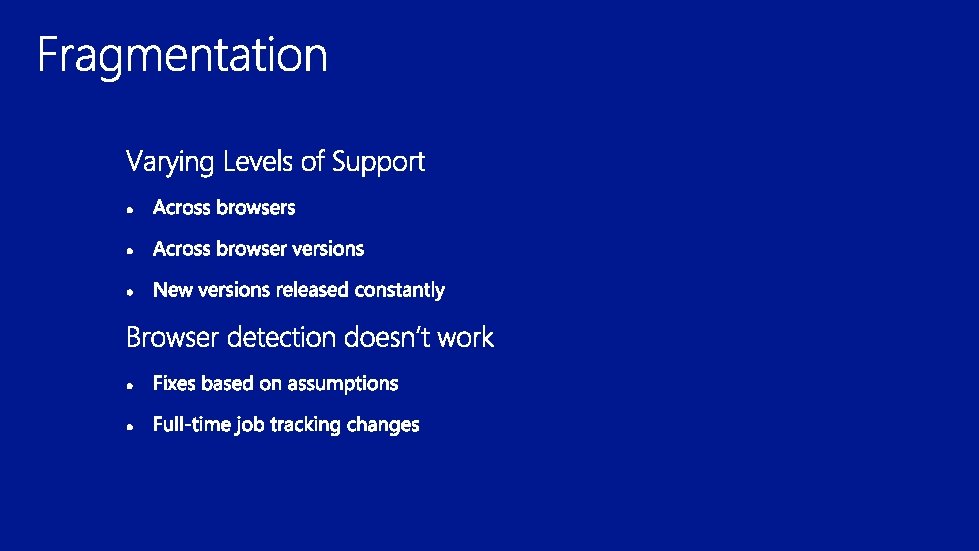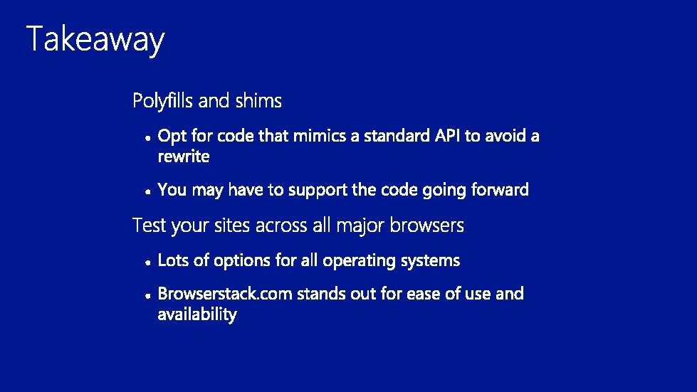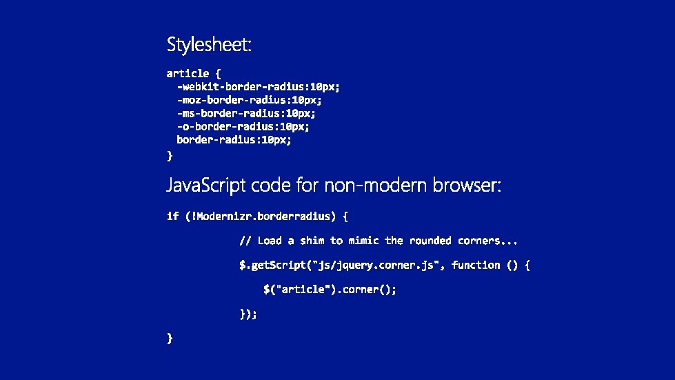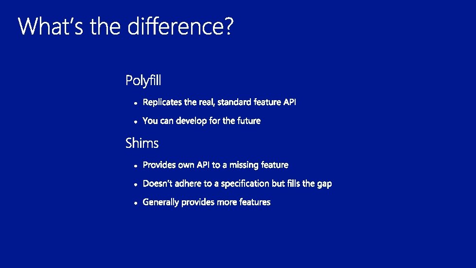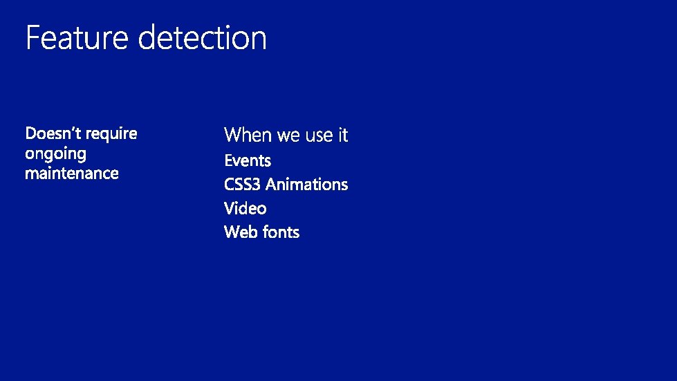• There were no recent additions or changes and no renaming or major changes are expected • Supported by at least two browsers other than Internet Explorer 10 • Interoperable across all these browsers for the features’ core use cases • Already used on the Web, including in their unprefixed form • Reached Candidate Recommendation or are likely to become Candidate Recommendations