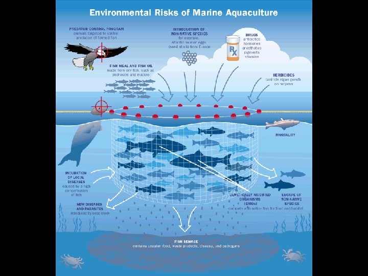 Impacts sur l’environnement Pisciculture Source de nombreuses pollutions Principaux rejets des activités piscicoles : - Particules : aliments non consommés, féces, cadavres, … - Matières organiques - CO 2 - Phosphates - Composés azotés : ammoniaque, nitrites, nitrates - Antibiotiques et autres substances médicamenteuses D’autres problèmes peuvent subvenir :