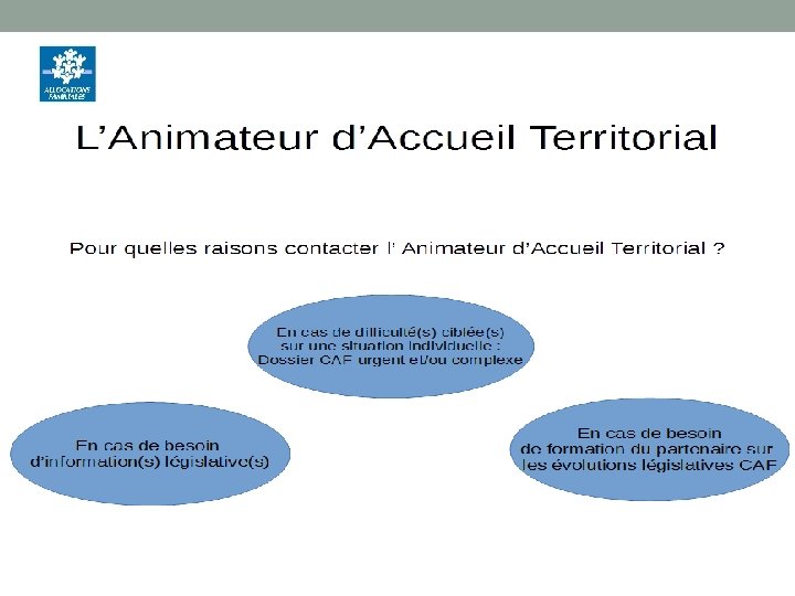 Comment contacter l’ Animateur d’Accueil CAF ? Par mail : Territoire de Longwy - Mme Guestin – aalongwy. cafnancy@caf. cnafmail. fr Territoire de Briey : Mme Guestin – aabriey. cafnancy@caf. cnafmail. fr Territoire du Val de Lorraine : Mme Da Costa - aavdlorraine. cafnancy@caf. cnafmail. fr Territoire de Nancy/Couronne : Mme Lemineur – aanancy. cafnancy@caf. cnafmail. fr Territoire de Terres de Lorraine : Mr Nobili – aatdlorraine. cafnancy@caf. cnafmail. fr Territoire du Lunévillois : Mr Nobili – aaluneville. cafnancy@caf. cnafmail. fr Depuis le 27/06/2016, l’ adresse mail « animateurs…. » ! n’est plus valide.