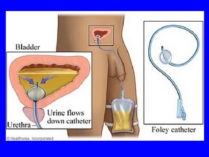 Cateterismo Vesical • Es el procedimiento mediante el cual se extrae • • orina de la vejiga a través de una sonda que se inserta en la uretra. Su objetivo es el drenaje continuo de orina con fines terapéuticos. El cateterismo o sondaje vesical es un procedimiento invasivo frecuente en los ingresos hospitalarios Su instalación es indicada por el médico