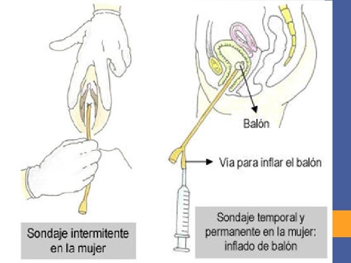 Objetivo del sondeo vesical üControl estricto de diuresis como método de diagnóstico y control hemodinámico üMantener drenaje permanente de la vejiga üPreparación pre-operatoria de intervenciones pélvicas. üVaciar vejiga en pacientes inconscientes y con retenciones urinarias crónicas. üRealizar tratamientos con irrigaciones vesicales.