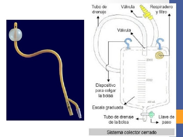 Cuidados • Mantener la bolsa colectora fijada al soporte para evitar traumatismos • estimular el aporte de líquidos de dos a tres litros por día, para aumentar el flujo urinario y evitar el riesgo de infección. • Limpieza de la zona perineal exhaustivamente cada 12 horas. • Valorar los indicadores de infección urinaria (aumento de la temperatura, escalofríos, dolor en flanco suprapúbico, orina turbia o mal oliente, hematuria).
