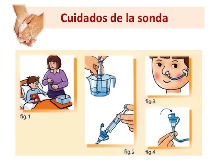Cuidados ümantener limpia la parte externa de la sonda (aseo diario con agua y jabón). (Fig 1). üInfundir entre 5 y 10 ml de agua, tras la administración de cada comida o medicamento (realizarlo cada 6 horas en caso de alimentación continua) (Fig 2) üComprobar la posición correcta de la sonda (Fig 3) üCambiar sonda siempre que este obstruida üCerrar siempre el conector de la sonda cuando no se administre alimentos, agua o medicamentos. üMantener diariamente una buena higiene en el paciente (evitar riesgo de infección) (Fig 4).