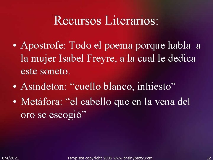 Recursos Literarios: • Apostrofe: Todo el poema porque habla a la mujer Isabel Freyre, a la cual le dedica este soneto. • Asíndeton: “cuello blanco, inhiesto” • Metáfora: “el cabello que en la vena del oro se escogió” 6/4/2021 Template copyright 2005 www. brainybetty. com 12