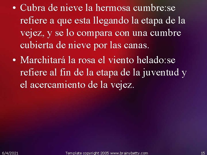 • Cubra de nieve la hermosa cumbre: se refiere a que esta llegando la etapa de la vejez, y se lo compara con una cumbre cubierta de nieve por las canas. • Marchitará la rosa el viento helado: se refiere al fin de la etapa de la juventud y el acercamiento de la vejez. 6/4/2021 Template copyright 2005 www. brainybetty. com 15