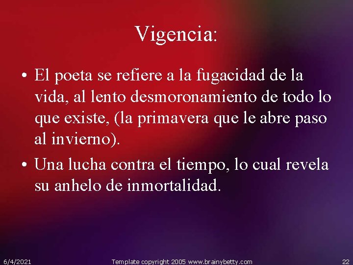 Vigencia: • El poeta se refiere a la fugacidad de la vida, al lento desmoronamiento de todo lo que existe, (la primavera que le abre paso al invierno). • Una lucha contra el tiempo, lo cual revela su anhelo de inmortalidad. 6/4/2021 Template copyright 2005 www. brainybetty. com 22