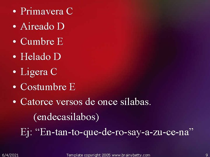 • • 6/4/2021 Primavera C Aireado D Cumbre E Helado D Ligera C Costumbre E Catorce versos de once sílabas. (endecasilabos) Ej: “En-tan-to-que-de-ro-say-a-zu-ce-na” Template copyright 2005 www. brainybetty. com 9