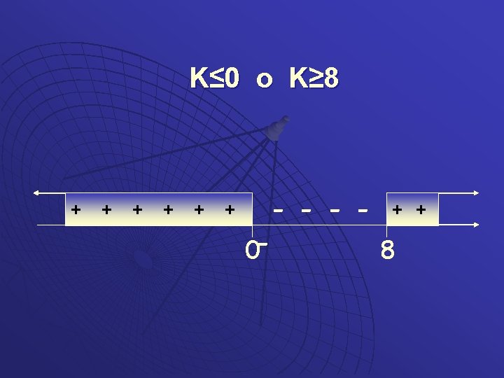 Nel nostro caso, a=1, b=k, c=2 k, per cui: k²-4(1)(2 k)≥ 0 K²-8 k≥ 0 K(k-8)≥ 0 da cui k≤ 0 o K≥ 8
