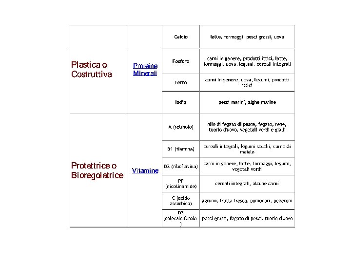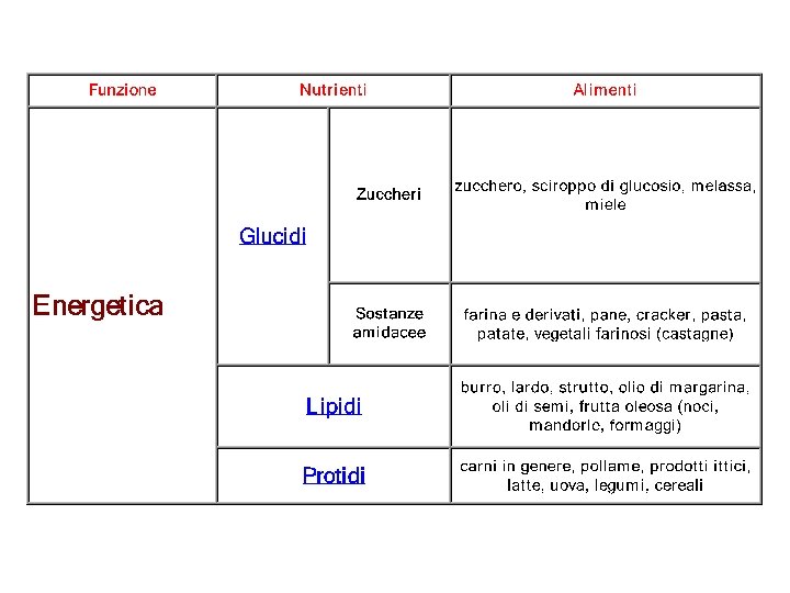 Funzione degli alimenti: • fornire materiale energetico per la produzione di calore, lavoro o altre forme di energia (protidi, glucidi, lipidi) • fornire materiale plastico per la crescita e la riparazione dei tessuti (protidi e minerali) • fornire materiale "regolatore" rendendo possibili le reazioni metaboliche (minerali e vitamine)