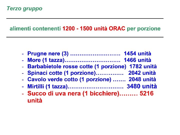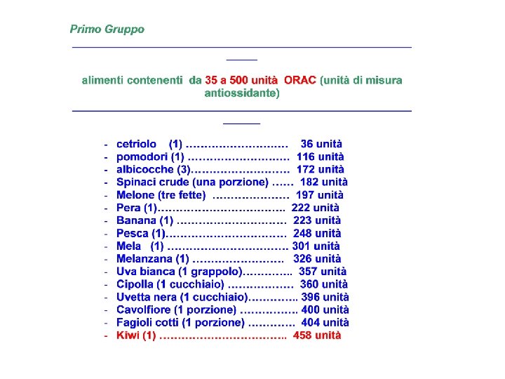 UNITA’ ORAC per 100 gr. alimento fresco - frutta Albicocche Melone Pera Banana Pesca Mela Uva bianca Uvetta nera Kiwi Uva nera 172 197 222 223 248 301 357 396 458 569 Avogado 571 Susina 626 Arancia 983 Spr. ta fresca arancia 1142 Fragole 1170 Pompelmo rosa 1188 Prugne nere 1454 Mirtilli 3480 Succo di uva nera 5216