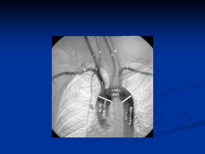 Answers to previous slide Aortic arch angiogram n 1. Innominate art. n 2. Right subclavian art. n 3. Right common carotid art. n 4. Right vertebral art. n 5. Left common carotid art. n 6. Left vertebral art. n 7. Left subclavian art.