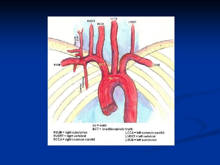 Anatomy n Aortic Arch n Innominate or Brachiocephalic artery n Right subclavian artery n Right common carotid Left common carotid artery n Left subclavian artery n n CCAs lie posterolateral to thyroid n Deep to sternocleidomastoid muscle n