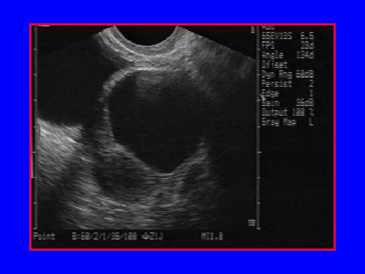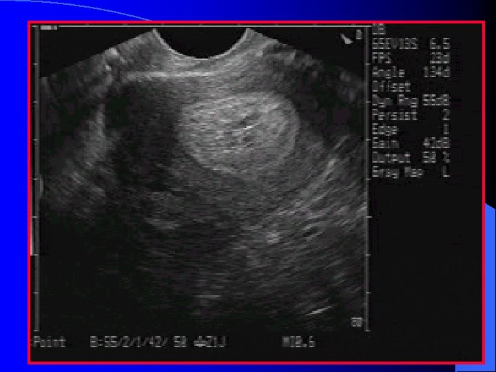 Ovarian Cysts l Follicular cyst (2. 5 – 10 cm) – Thin, round, unilocular l Functional corpus luteum cyst – Normal up to 16 weeks GA – Appears as a unilateral, unilocular 5 -11 cm cyst – Appearance can be highly variable – Hemorrhage inside the cyst not uncommon
