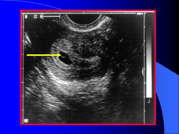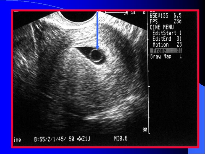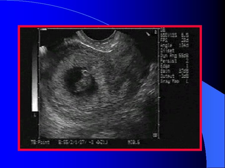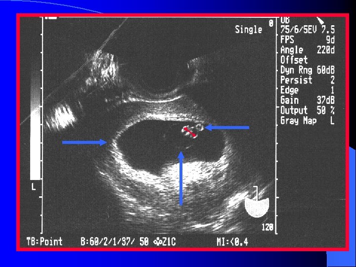 Assessment of the Pregnant Patient l Identify gestational sac l Demonstrate a myometrial mantle in the transverse view l Identify l Note yolk sac and/or fetal pole if there is fluid in the cul-de-sac