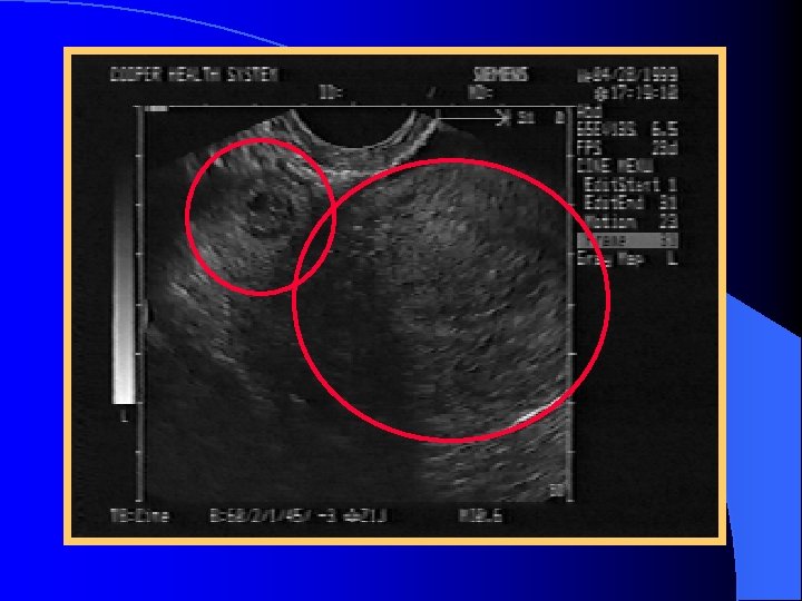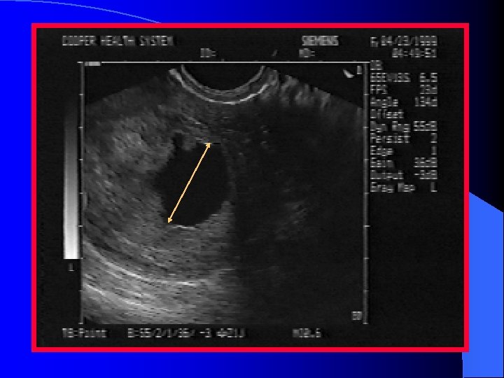 Endometrial Stripe (ES) Measurements l In the post-partum patient, a thickened ES is suggestive of retained products of conception l In the pregnant patient, an ES measurement of < 8 mm in the absence of an IUP is suggestive of EP l Thickening of the endometrial stripe in the postmenopausal patient with vaginal bleeding should raise suspicions for endometrial carcinoma
