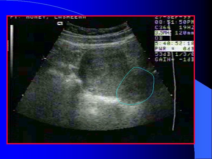 Imaging: Transabdominal Uses a lower frequency transducer: 3. 5 – 5 m. Hz l Better penetration, larger field of view l It should be the initial imaging window to assess for l – Advanced IUP – Fibroids/masses – Pelvic fluid l The bladder should be full to provide an acoustic window
