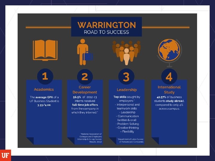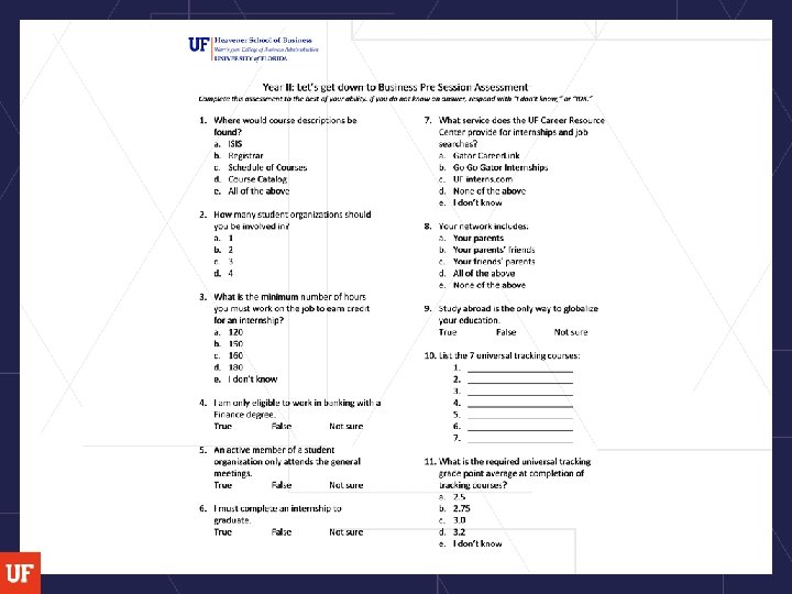 Cohorts § Fall semester: § students who took Intro to Business as freshmen (and have above a 3. 0 UF GPA) § students in Florida Leadership Academy § Spring Semester § Students who did not take WW (regardless of GPA) *matriculated in within last 2 terms § those who have below a 3. 0 GPA *matriculated in within last 2 terms § Innovation Academy students (cohort of students with Spring/Summer schedule)