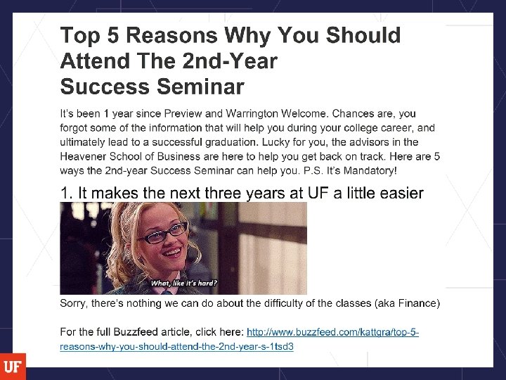 Rebranding § Name Change: Second Year Success Seminar § Change in emails: Buzzfeed articles § Integration of different workshop options