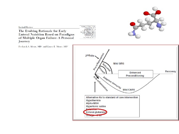 GLUTAMINA § El intestino capta preferencialmente Gln cuando esta se administra por vía enteral (menor nivel arterial, mayor extracción fraccional intestinal), en comparación con la administración parenteral § La vía de administración afecta a la conversión cuantitativa de Gln en citrulina (mayor nivel arterial si Gln enteral) y en la subsecuente síntesis renal de arginina (con ambas vías de administración) ORNITINA CITRULINA ARGININA