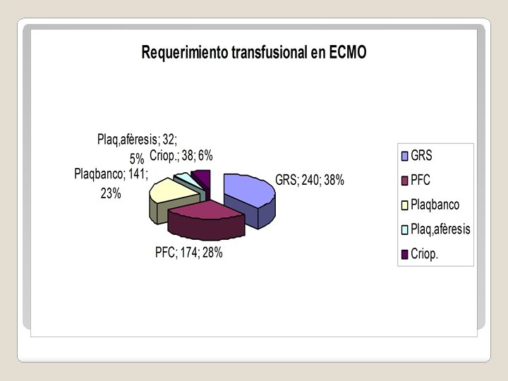 Requerimiento transfusional ECMO Año 2011 -2013 14 pacientes pediátricos TRANSFUSIONES TOTALES 625 TRANSFUSIONES GRS 240 TRANSFUSIONES PFC 174 TRANSFUSIONES Plaq. Banco TRANSFUSIONES Plaq. aféresis CRIOPRECIPITADOS 141 32 38