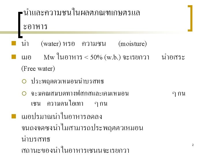 ตวอยางท n n n 2 The initial moisture content of a food products is 77% (wet basis), and the critical moisture content is 30% (wet basis). If the constant drying rate is 0. 1 kg H 2 O/m 2. s, compute the time required for the product to begin the falling-rate drying period. The product has a cube shape with 5–cm side, and the initial product density is 950 kg/m 3. 24