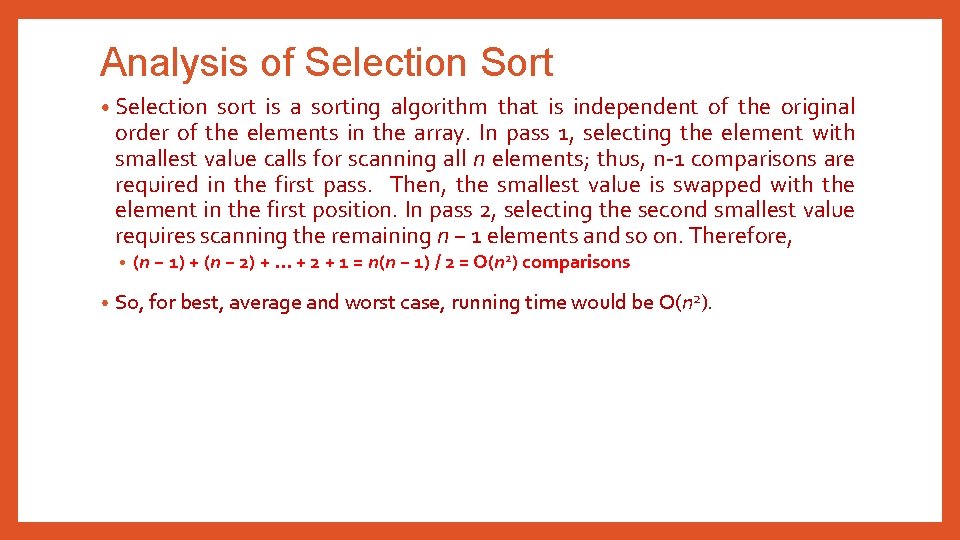 Analysis of Selection Sort • Selection sort is a sorting algorithm that is independent of the original order of the elements in the array. In pass 1, selecting the element with smallest value calls for scanning all n elements; thus, n-1 comparisons are required in the first pass. Then, the smallest value is swapped with the element in the first position. In pass 2, selecting the second smallest value requires scanning the remaining n − 1 elements and so on. Therefore, • • (n − 1) + (n − 2) +. . . + 2 + 1 = n(n − 1) / 2 = O(n 2) comparisons So, for best, average and worst case, running time would be O(n 2).