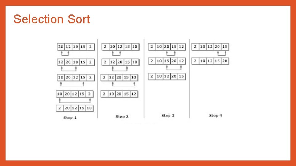 Selection Sort • The algorithm divides the input list into two parts: • the sublist of items already sorted, which is built up from left to right at the front (left) of the list, • and the sublist of items remaining to be sorted that occupy the rest of the list. • Initially, the sorted sublist is empty and the unsorted sublist is the entire input list. • The algorithm proceeds by finding the smallest (or largest, depending on sorting order) element in the unsorted sublist, exchanging it with the leftmost unsorted element (putting it in sorted order), and moving the sublist boundaries one element to the right.