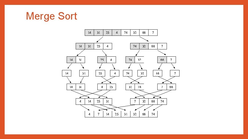 Merge Sort • Technique: • If the array is of length 0 or 1, then it is already sorted. Otherwise: • (Conceptually) divide the unsorted array into two sub- arrays of about half the size. • Use merge sort algorithm recursively to sort each sub-array • Merge the two sub-arrays to form a single sorted list