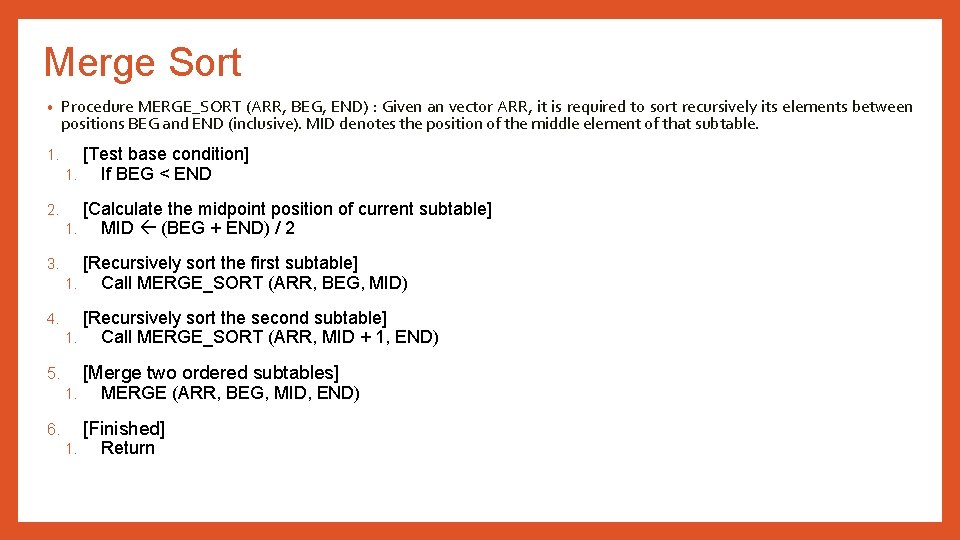 Merge Sort • Procedure MERGE_SORT (ARR, BEG, END) : Given an vector ARR, it is required to sort recursively its elements between positions BEG and END (inclusive). MID denotes the position of the middle element of that subtable. 1. [Test base condition] 1. If BEG < END 2. [Calculate the midpoint position of current subtable] 1. MID (BEG + END) / 2 3. [Recursively sort the first subtable] 1. Call MERGE_SORT (ARR, BEG, MID) 4. [Recursively sort the second subtable] 1. Call MERGE_SORT (ARR, MID + 1, END) [Merge two ordered subtables] 5. 1. MERGE (ARR, BEG, MID, END) [Finished] 6. 1. Return
