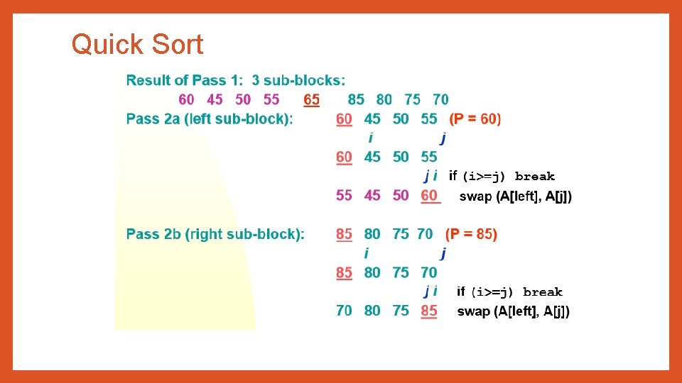 Quick Sort • Procedure QUICK_SORT (K, LB, UB) : Given a table K of N records, this recursive procedure sorts the table in ascending order. A dummy record with K[N + 1] assumed where K[I] ≤ K[N + 1] for all 1 ≤ I ≤ N. The integer parameters LB and UB denote the lower and upper bounds of the certain subtable being processed. The indices I and J are used to select certain keys during the processing of each subtable. KEY contains the key value which is being places in its final position with the sorted subtable. FLAG is a logical variable which indicates the end of the process that places a record in its final position. When FLAG becomes false, the input subtable has been partitioned into two disjointed parts. 1. [Initialize] 1. FLAG TRUE 2. [Perform sort] 1. If LB < UB 2. Then I LB 1. J UB + 1 2. KEY K[LB] 3. Repeat while FLAG 1. I I+1 2. Repeat while K[I] < KEY && I <= UB 1. I I+1 3. J J-1 4. Repeat while K[J] > KEY && J >= LB 1. J J – 1 5. If I < J 1. Then K[I] K[J] 2. Else FLAG False 6. K[LB] K[J] 7. Call Quick_Sort(K, LB, J – 1) 8. Call Quick_Sort(K, J + 1, UB) 3. [Finished] 1. Return