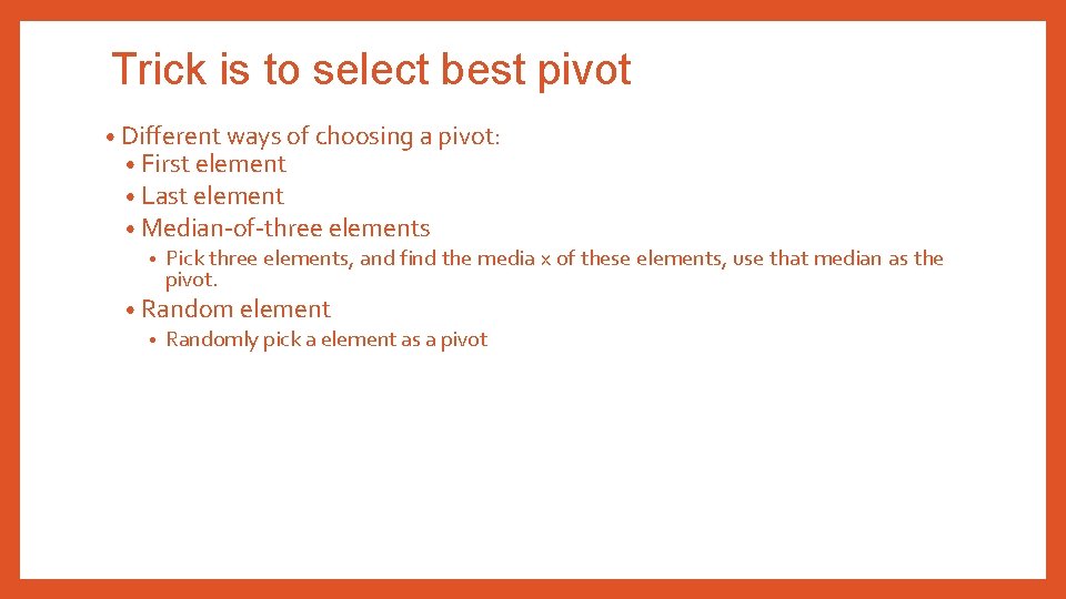 Trick is to select best pivot • Different ways of choosing a pivot: • First element • Last element • Median-of-three elements • Pick three elements, and find the media x of these elements, use that median as the pivot. • Random element • Randomly pick a element as a pivot