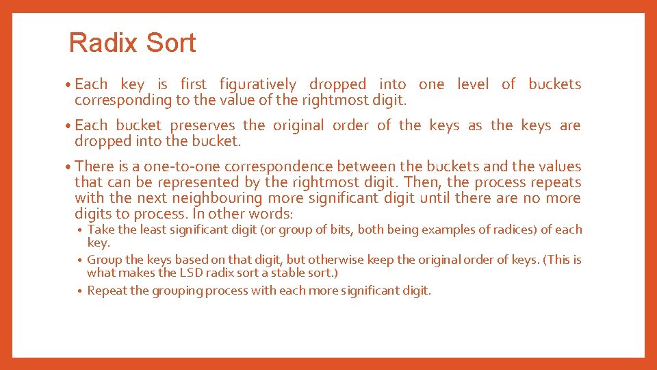 Radix Sort • Each key is first figuratively dropped into one level of buckets corresponding to the value of the rightmost digit. • Each bucket preserves the original order of the keys as the keys are dropped into the bucket. • There is a one-to-one correspondence between the buckets and the values that can be represented by the rightmost digit. Then, the process repeats with the next neighbouring more significant digit until there are no more digits to process. In other words: Take the least significant digit (or group of bits, both being examples of radices) of each key. • Group the keys based on that digit, but otherwise keep the original order of keys. (This is what makes the LSD radix sort a stable sort. ) • Repeat the grouping process with each more significant digit. •