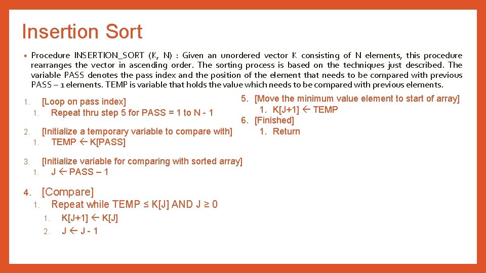 Insertion Sort • Procedure INSERTION_SORT (K, N) : Given an unordered vector K consisting of N elements, this procedure rearranges the vector in ascending order. The sorting process is based on the techniques just described. The variable PASS denotes the pass index and the position of the element that needs to be compared with previous PASS – 1 elements. TEMP is variable that holds the value which needs to be compared with previous elements. 5. [Move the minimum value element to start of array] 1. K[J+1] TEMP 6. [Finished] 1. Return 2. [Initialize a temporary variable to compare with] 1. TEMP K[PASS] 1. [Loop on pass index] 1. Repeat thru step 5 for PASS = 1 to N - 1 3. [Initialize variable for comparing with sorted array] 1. J PASS – 1 [Compare] 4. Repeat while TEMP ≤ K[J] AND J ≥ 0 1. 1. 2. K[J+1] K[J] J J-1
