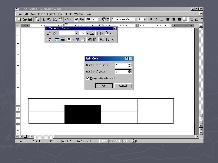 ► Memisahkan Sel icon Draw Table yang terdapat pada menu Table atau pada icon Tables and Borders yang berada pada toolbar standard, sehingga pointer/ kursor berubah menjadi pena. Kemudian klik dan drag untuk membuat pemisahan sel pada lokasi yang diinginkan. ► Atau pilih dan drag sel yang ingin dipisahkan, kemudian klik icon Split Cells pada menu Table atau pada icon Tables and Borders ► yang berada pada toolbar standard. Kemudian pilih opsi-opsi yang tersedia dalam kotak dialog, setelah itu klik OK. ► Klik