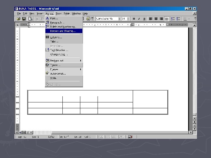 ► Menambahkan Border ► Pilih sel-sel yang ingin diberi border, pada menu Format pilih Borders and Shading, kemudian klik tab halaman Borders.
