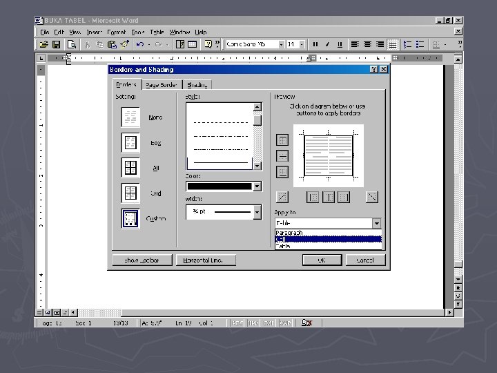 ► Tentukan satu atau lebih opsi-opsi yang ada sesuai keinginan. Pastikan anda telah menentukan opsi penerapan border pada objek yang dipilih pada kotak Apply to. Lalu klik OK. ► Untuk mempercepat penggunaan tipe border baru atau menghilangkan border dari sel yang diblok, gunakan palete Border pada toolbar standard atau Tables and Borders