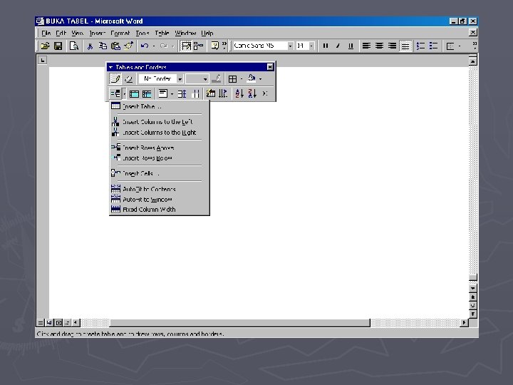 MENGATUR FORMAT TABEL ► Setelah membuat/ menyisipkan tabel kemudian mengisi dan mengedit teks pada tabel, anda dapat mengatur format tabel tersebut agar sesuai kebutuhan sehingga tampak rapi dan menarik. ► Menggabungkan Sel ► Klik icon Tables and Borders pada toolbar standard. Pilih icon penghapus (eraser) kemudian klik dan drag penghapus melewati pemisah sel yang akan dihapus.