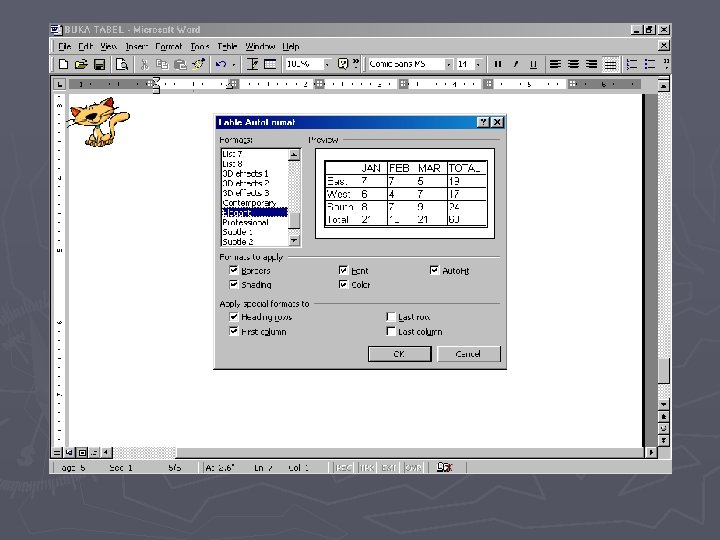 ► Untuk menghapus garis, klik icon yang bergambar penghapus dan drag di atas garis yang akan dihapus. ► Anda dapat memperindah (memformat) tampilan tabel dengan menggunakan Table Auto. Format: § Klik pada tabel yang akan diperindah (diformat) § Pada menu Table, klik perintah Table Auto. Format (lihat pada gambar halaman 11), sehingga akan tampil kotak dialog seperti ini :