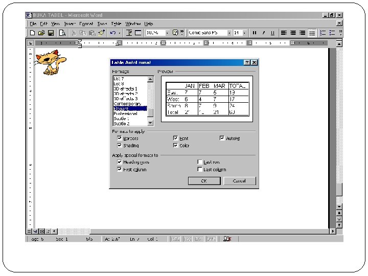 Untuk menghapus garis, klik icon yang bergambar penghapus dan drag di atas garis yang akan dihapus. Anda dapat memperindah (memformat) tampilan tabel dengan menggunakan Table Auto. Format: Klik pada tabel yang akan diperindah (diformat) Pada menu Table, klik perintah Table Auto. Format (lihat pada gambar halaman 11), sehingga akan tampil kotak dialog seperti ini :