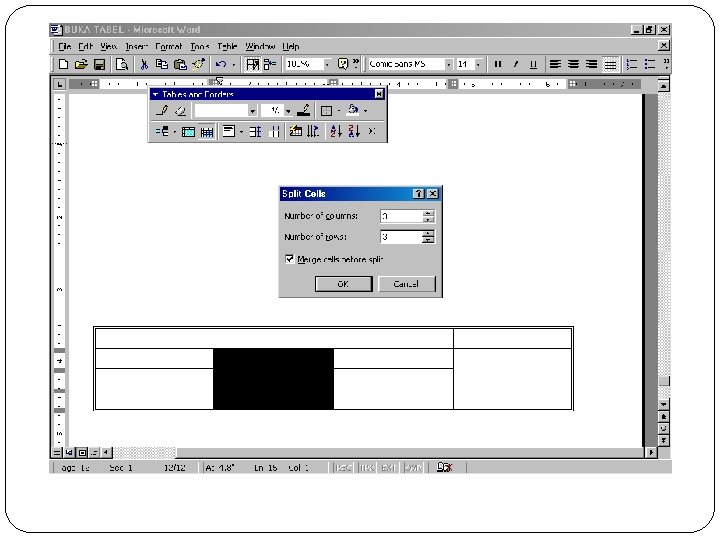 ► Memisahkan Sel icon Draw Table yang terdapat pada menu Table atau pada icon Tables and Borders yang berada pada toolbar standard, sehingga pointer/ kursor berubah menjadi pena. Kemudian klik dan drag untuk membuat pemisahan sel pada lokasi yang diinginkan. ► Atau pilih dan drag sel yang ingin dipisahkan, kemudian klik icon Split Cells pada menu Table atau pada icon Tables and Borders ► yang berada pada toolbar standard. Kemudian pilih opsi-opsi yang tersedia dalam kotak dialog, setelah itu klik OK. ► Klik