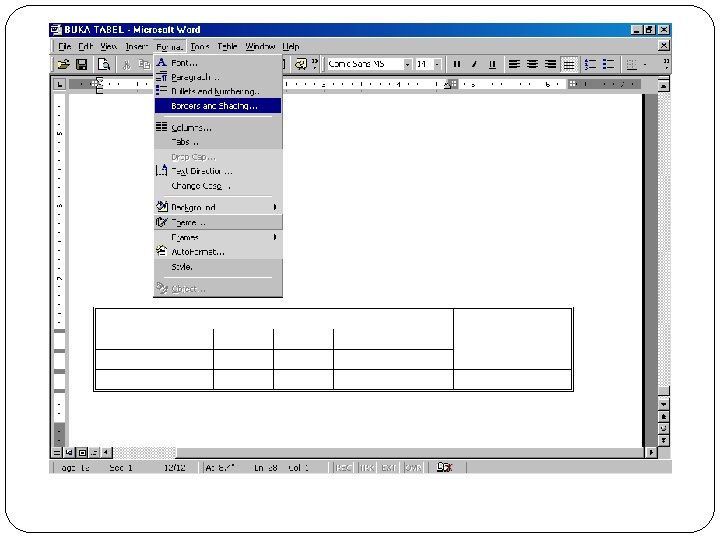 ► Menambahkan Border ► Pilih sel-sel yang ingin diberi border, pada menu Format pilih Borders and Shading, kemudian klik tab halaman Borders.