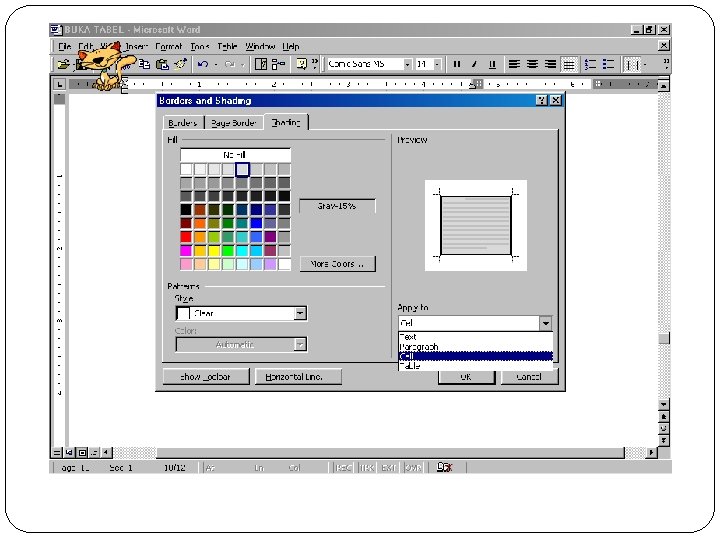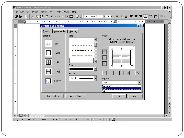 ► Tentukan satu atau lebih opsi-opsi yang ada sesuai keinginan. Pastikan anda telah menentukan opsi penerapan border pada objek yang dipilih pada kotak Apply to. Lalu klik OK. ► Untuk mempercepat penggunaan tipe border baru atau menghilangkan border dari sel yang diblok, gunakan palete Border pada toolbar standard atau Tables and Borders