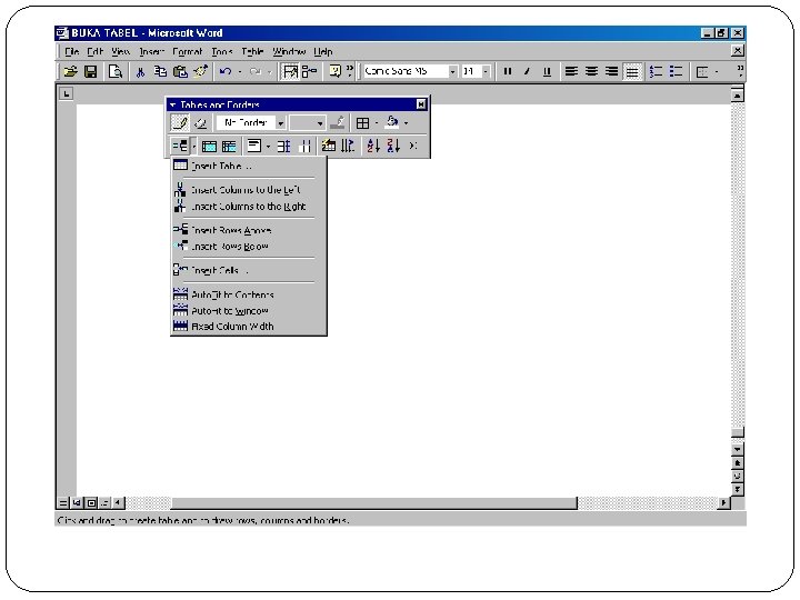 MENGATUR FORMAT TABEL ► Setelah membuat/ menyisipkan tabel kemudian mengisi dan mengedit teks pada tabel, anda dapat mengatur format tabel tersebut agar sesuai kebutuhan sehingga tampak rapi dan menarik. ► Menggabungkan Sel ► Klik icon Tables and Borders pada toolbar standard. Pilih icon penghapus (eraser) kemudian klik dan drag penghapus melewati pemisah sel yang akan dihapus.