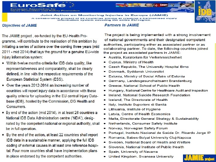 Aim • To support NDAs in estimating the Burden of Injury (Bo. I) within their country - Disability Adjusted Life Years (DALYs) - Direct Medical Costs of injuries Working together to make Europe a safer place