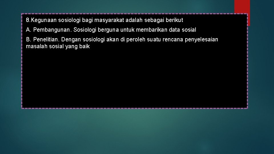 8. Kegunaan sosiologi bagi masyarakat adalah sebagai berikut A. Pembangunan. Sosiologi berguna untuk membarikan data sosial B. Penelitian. Dengan sosiologi akan di peroleh suatu rencana penyelesaian masalah sosial yang baik