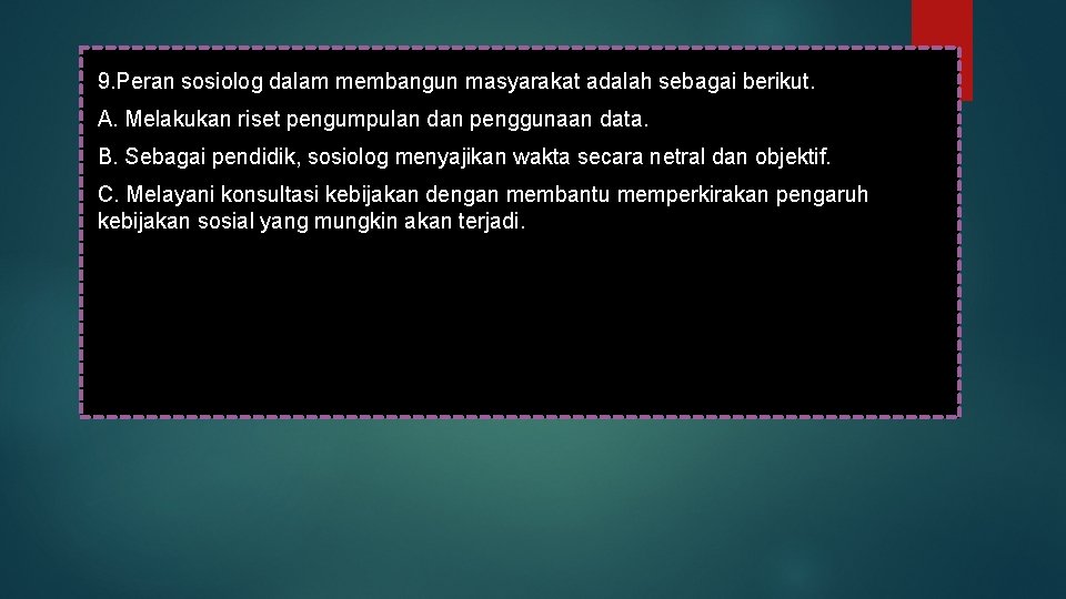 9. Peran sosiolog dalam membangun masyarakat adalah sebagai berikut. A. Melakukan riset pengumpulan dan penggunaan data. B. Sebagai pendidik, sosiolog menyajikan wakta secara netral dan objektif. C. Melayani konsultasi kebijakan dengan membantu memperkirakan pengaruh kebijakan sosial yang mungkin akan terjadi.