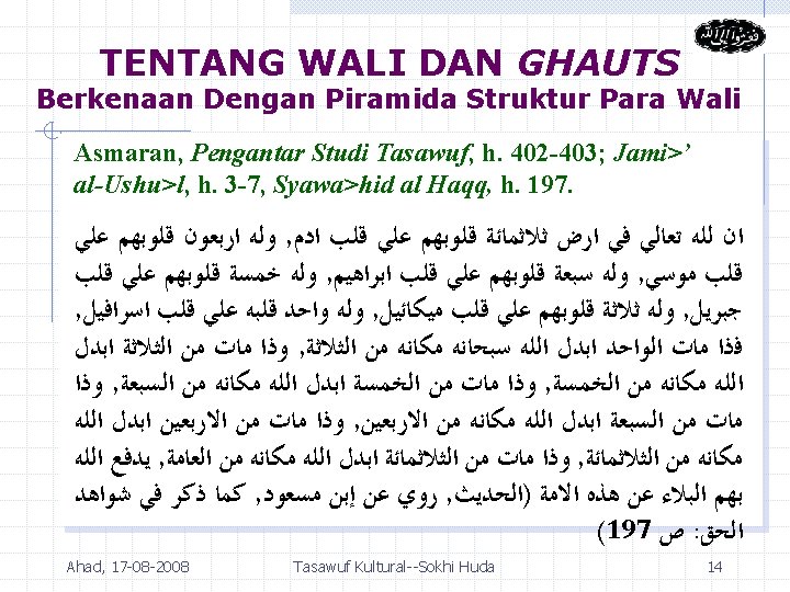 PIRAMIDA STRUKTUR WALI-WALI PENGHUNI ALAM GAIB (PEGAWAI-PEGAWAI ALLAH) 1 orang (Quthb/Ghauts) 4 orang (Awta>d) 3 orang (Nuqaba>') 7 orang (Abra>r) 40 orang (Abda>l) 300 orang (Akhya>r) Ahad, 17 -08 -2008 Tasawuf Kultural--Sokhi Huda 13