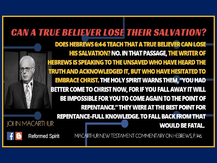 Dr. Roger R. Nicole Professor Emeritus - Gordon-Conwell Theological Seminary “The most immediate impulse would be to interpret this cluster of statements as describing regenerate persons. " R. Nicole, “Some Comments on Hebrews 6: 4 -6 and the Doctrine of the Perseverance of God with the Saints, ” in Current Issues in Biblical and Patristic Interpretation, ed. G. G. Hawthorne (Grand Rapids: Eerdmans, 1975), 356.
